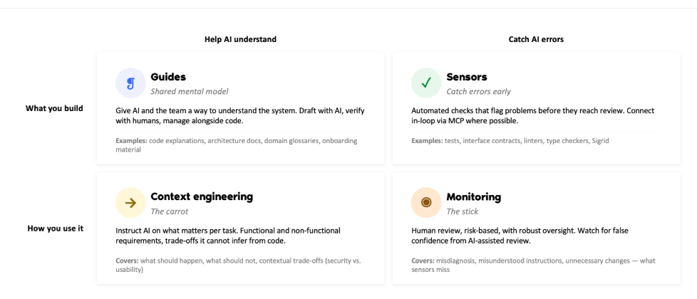 Before an agent generates a single line of code, it needs a shared mental model of the system it’s working in. Guides give AI and the team a way to understand the codebase: architecture docs, code explanations, domain glossaries, and onboarding material. Draft them with AI, verify with humans, and manage them alongside code.