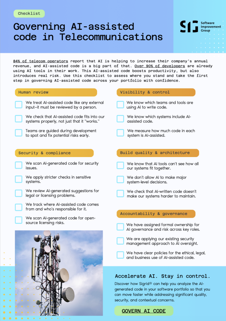 Monitor and improve your entire software landscape in real time with Sigrid®—combining deep source-code analysis, AI-integrated insights via MCP, and benchmarking against global standards.