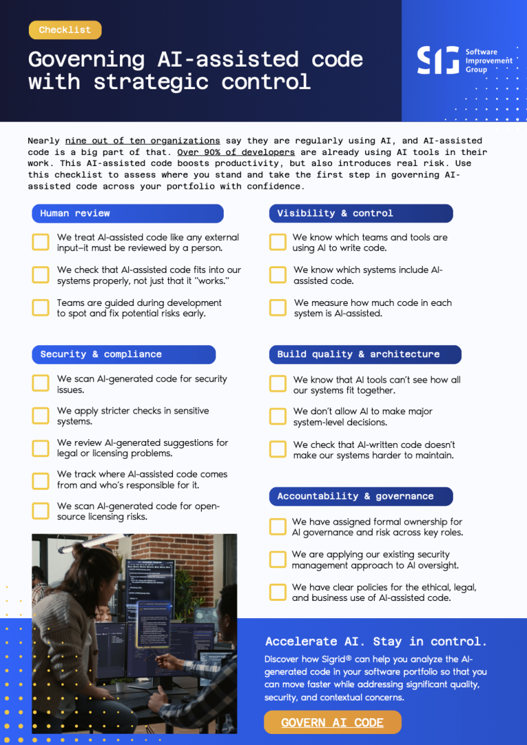 Monitor and improve your entire software landscape in real time with Sigrid®—combining deep source-code analysis, AI-integrated insights via MCP, and benchmarking against global standards.