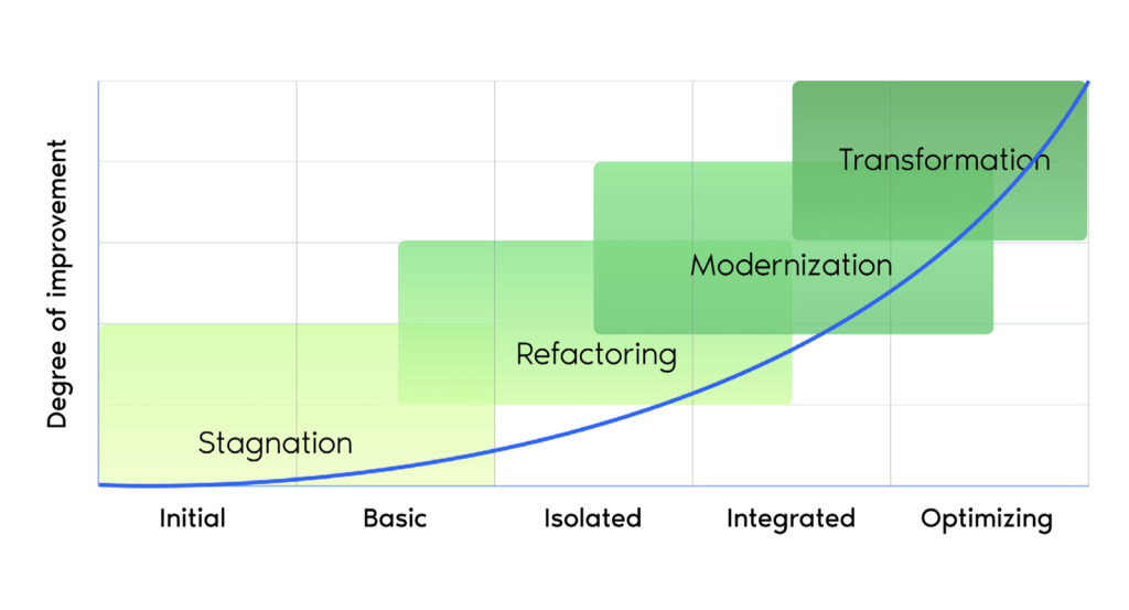 Our IT Maturity Framework is based on 25+ years of analyzing software systems and guiding global technology leaders to increase innovation, lower costs, and move faster. It helps you pinpoint where you stand today — from Stagnation to Transformation.